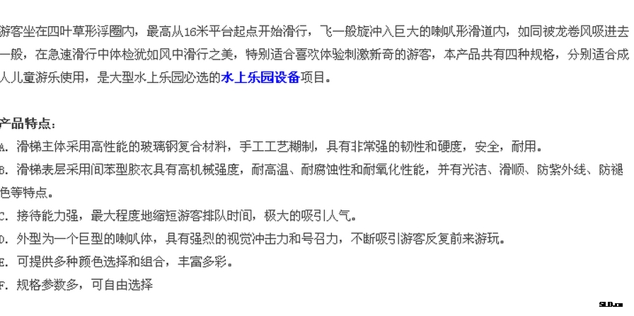 水上樂(lè)園設(shè)施您當(dāng)前的位置:網(wǎng)站首頁(yè) > 產(chǎn)品展示 > 水上樂(lè)園設(shè)備 > 水上樂(lè)園設(shè)施>大喇叭滑梯